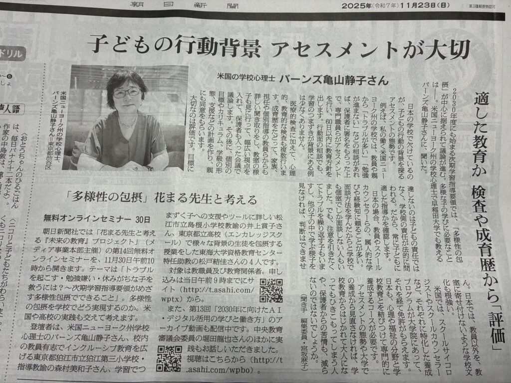2025-11-26 / 最終更新日時 : 2025-11-26 JAMSNET NEWS/EVENT 朝日新聞11/23記事:バーンズ静子氏「子どもの行動背景 アセスメントが大切」 JAMSNET-USA Co-Secretary、またJAMSNETメンタルヘルスネットワークでご尽力のバーンズ静子氏の朝日新聞記事をご紹介させていただきます。 関連 FacebookXBlueskyCopy